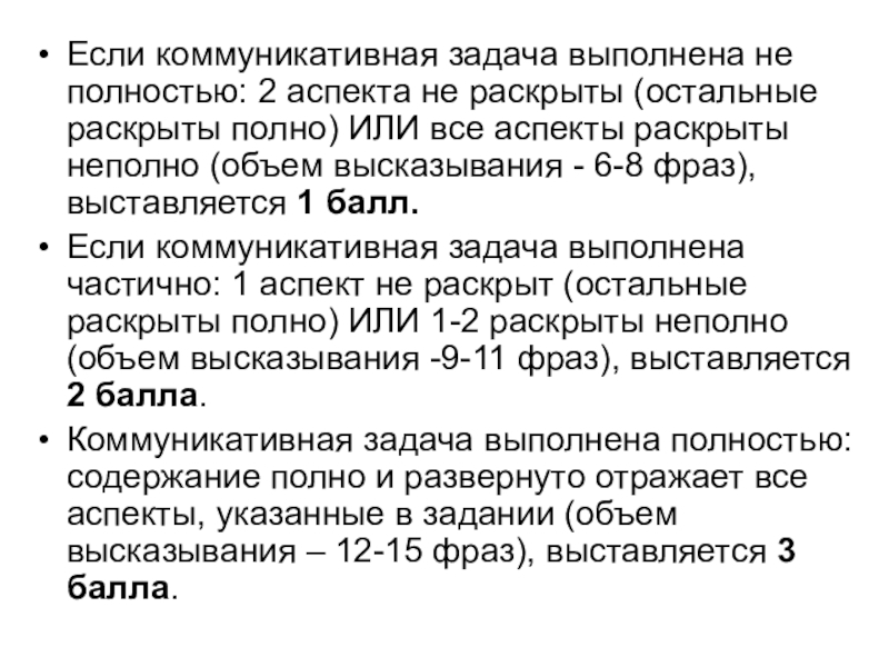 Если коммуникативная задача выполнена частично: 1 аспект не раскрыт (остальные раскрыты полно) ИЛИ 1-2 раскрыты неполно (объем высказывания -9-11 фраз), выставляется 2 балла.