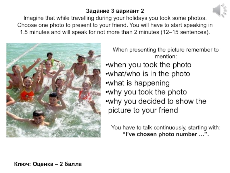 took some photos. Choose one photo to present to your friend. You will have to start speaking in 1.5 minutes and will speak for not more than 2 minutes (12–15 sentences).