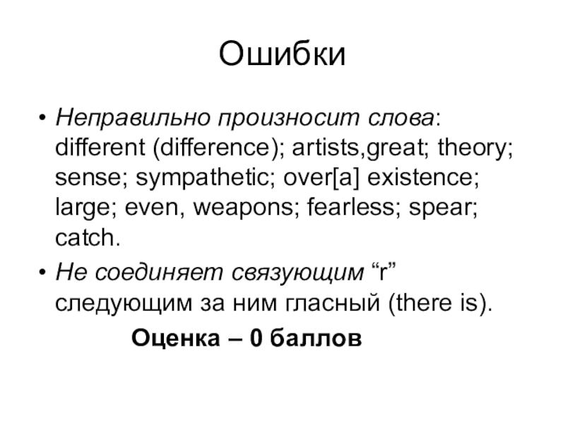 Неправильно произносит слова: different (difference); artists,great; theory; sense; sympathetic; over[a]