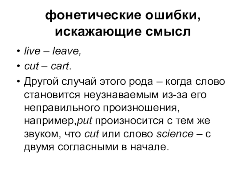 случай этого рода – когда слово становится неузнаваемым из-за его неправильного произношения, например,put произносится с тем же звуком, что cut или слово science – с двумя согласными в начале.