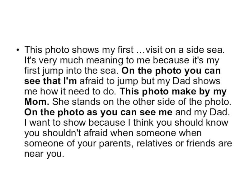 very much meaning to me because it's my first jump into the sea. On the photo you can see that I'm afraid to jump but my Dad shows me how it need to do. This photo make by my Mom. She stands on the other side of the photo. On the photo as you can see me and my Dad. I want to show because I think you should know you shouldn't afraid when someone when someone of your parents, relatives or friends are near you.