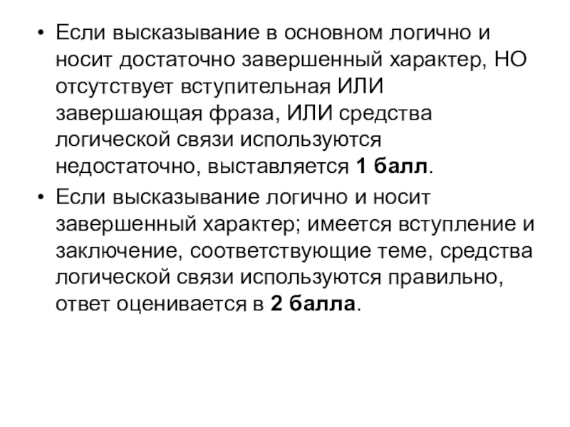 Если высказывание логично и носит завершенный характер; имеется вступление и заключение, соответствующие теме, средства логической связи используются правильно, ответ оценивается в 2 балла.