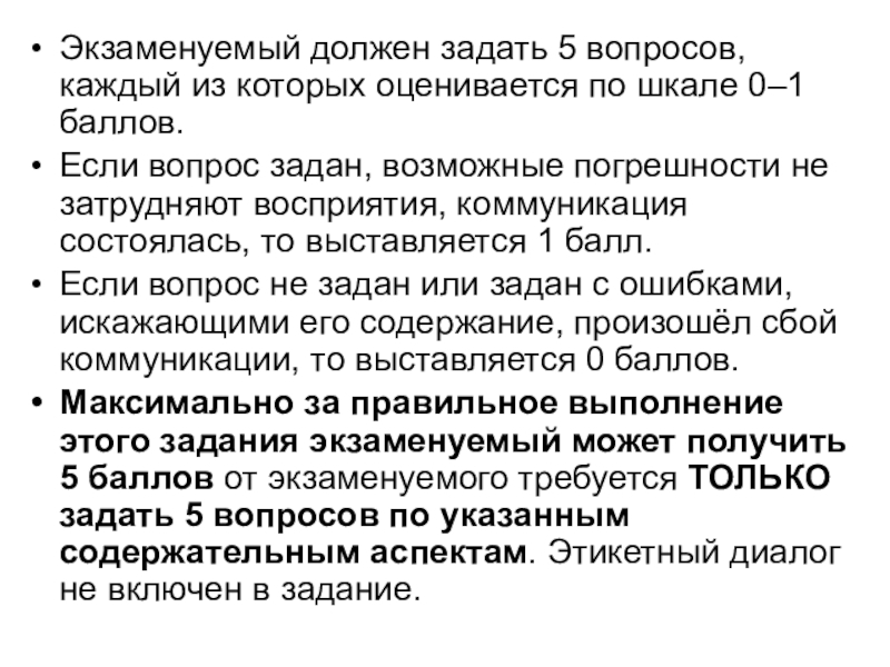 Слайд 16Экзаменуемый должен задать 5 вопросов, каждый из которых оценивается по шкале