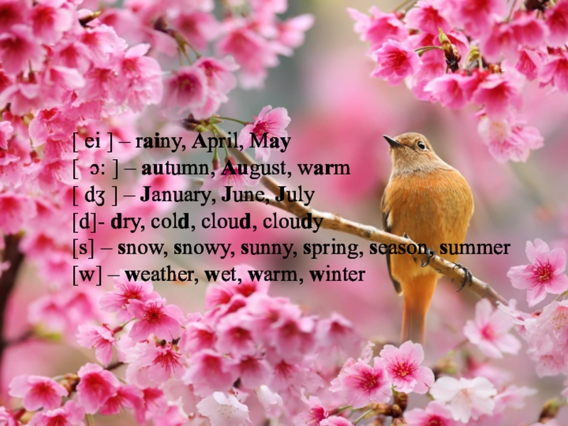 [ ei ] – rainy, April, May [ ɔ: ] – autumn, August, warm [ dʒ ] – January, June, July [d]- dry, cold, cloud, cloudy [s] – snow, snowy, sunny, spring, season, summer [w] –