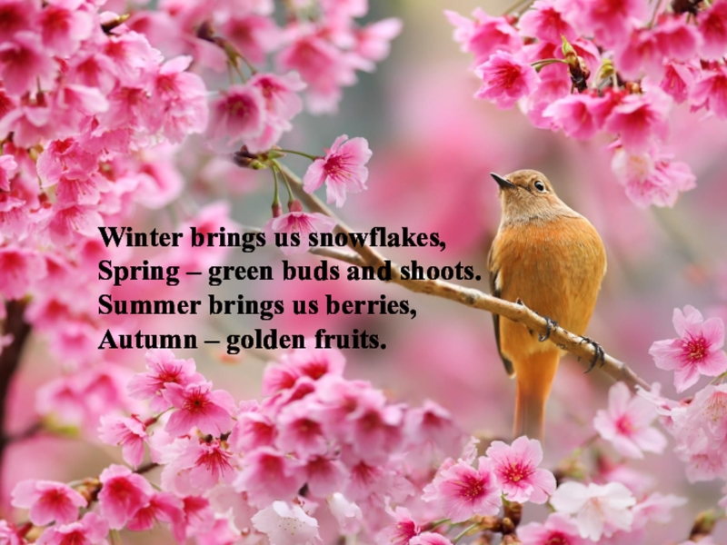 Winter brings us snowflakes,Spring – green buds and shoots.Summer brings us berries,Autumn – golden fruits.