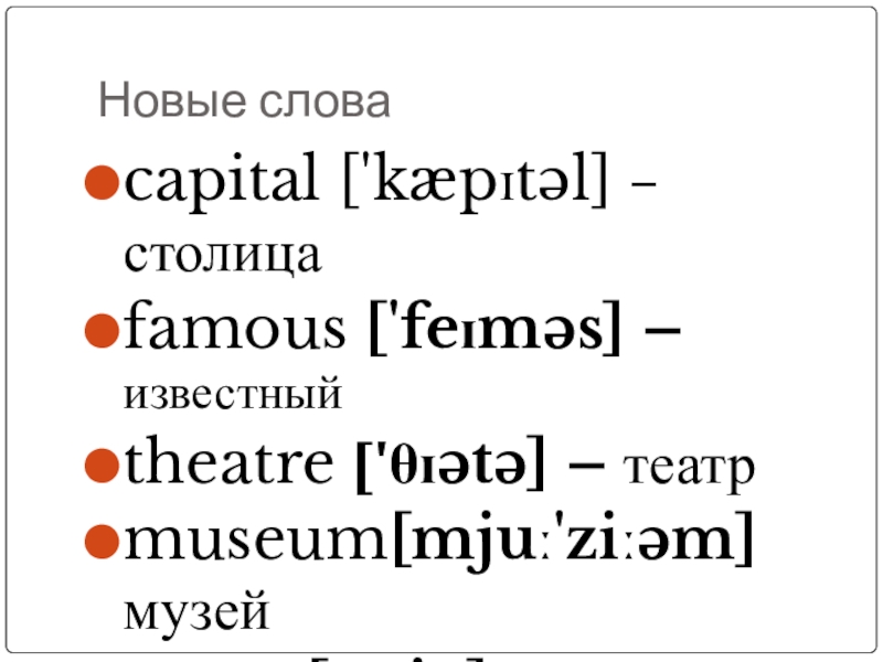 Новые словаcapital ['kæpɪtəl] – столицаfamous ['feɪməs] – известныйtheatre ['θɪətə] – театрmuseum[mjuː'ziːəm] музейstreet [striːt] - улица