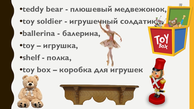 teddy bear - плюшевый медвежонок,toy soldier - игрушечный солдатик,ballerina - балерина, toy – игрушка,shelf - полка, toy