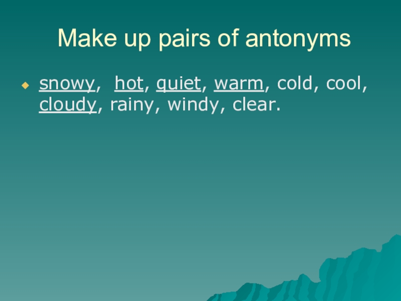 Make up pairs of antonymssnowy, hot, quiet, warm, cold, cool, cloudy, rainy, windy, clear.