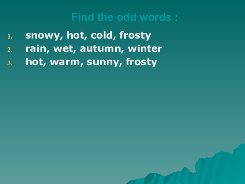 Find the odd words :snowy, hot, cold, frostyrain, wet, autumn, winterhot, warm, sunny, frosty