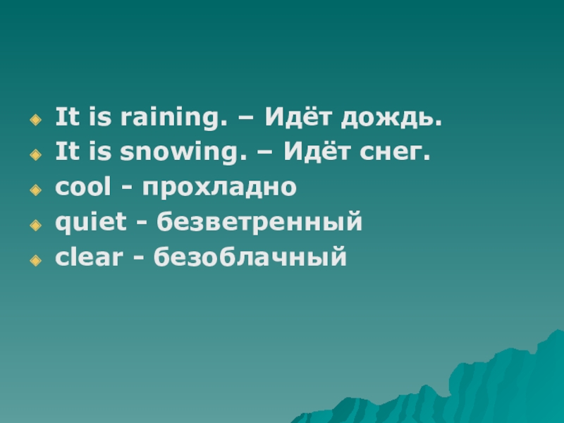 It is raining. – Идёт дождь.It is snowing. – Идёт снег.cool - прохладноquiet - безветренныйclear - безоблачный