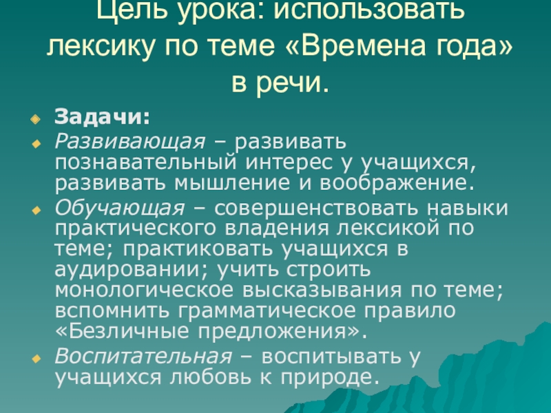 Цель урока: использовать лексику по теме «Времена года» в речи.Задачи: Развивающая – развивать познавательный интерес у учащихся, развивать мышление и воображение.Обучающая – совершенствовать навыки практического владения лексикой по теме; практиковать учащихся в аудировании; учить строить монологическое