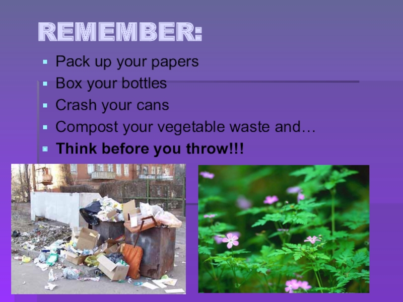 REMEMBER:Pack up your papersBox your bottlesCrash your cansCompost your vegetable waste and…Think before you throw!!!