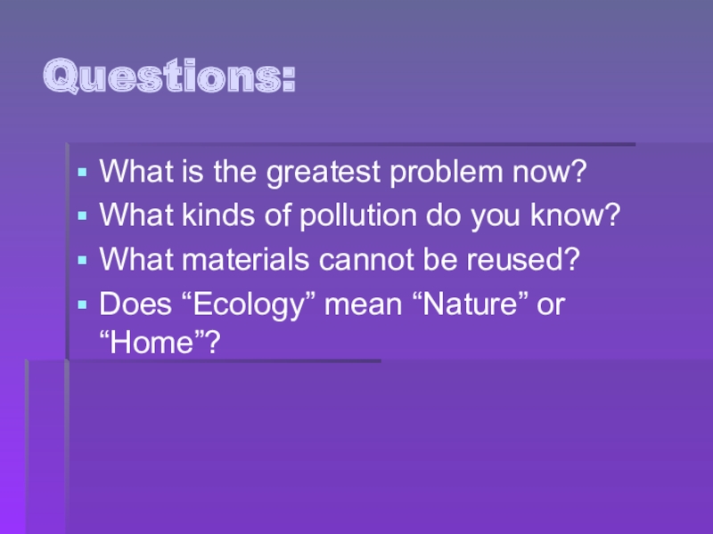 Questions:What is the greatest problem now?What kinds of pollution do you know?What materials cannot be reused?Does “Ecology”