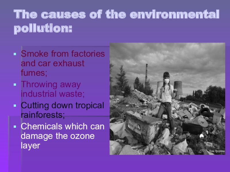 The causes of the environmental pollution:Smoke from factories and car exhaust fumes;Throwing away industrial waste;Cutting down tropical