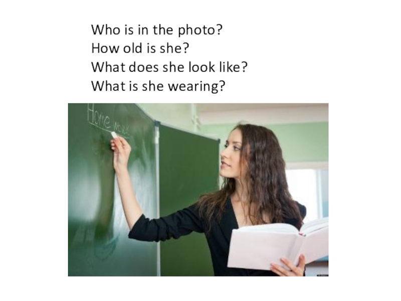 She is standing at the blackboard / is sitting on the floor / lying on the carpet / is reading a book / is making sums / is making gifts.