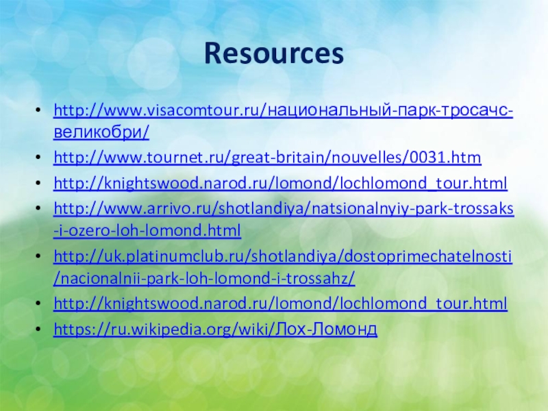 Resourceshttp://www.visacomtour.ru/национальный-парк-тросачс-великобри/http://www.tournet.ru/great-britain/nouvelles/0031.htmhttp://knightswood.narod.ru/lomond/lochlomond_tour.htmlhttp://www.arrivo.ru/shotlandiya/natsionalnyiy-park-trossaks-i-ozero-loh-lomond.htmlhttp://uk.platinumclub.ru/shotlandiya/dostoprimechatelnosti/nacionalnii-park-loh-lomond-i-trossahz/http://knightswood.narod.ru/lomond/lochlomond_tour.htmlhttps://ru.wikipedia.org/wiki/Лох-Ломонд