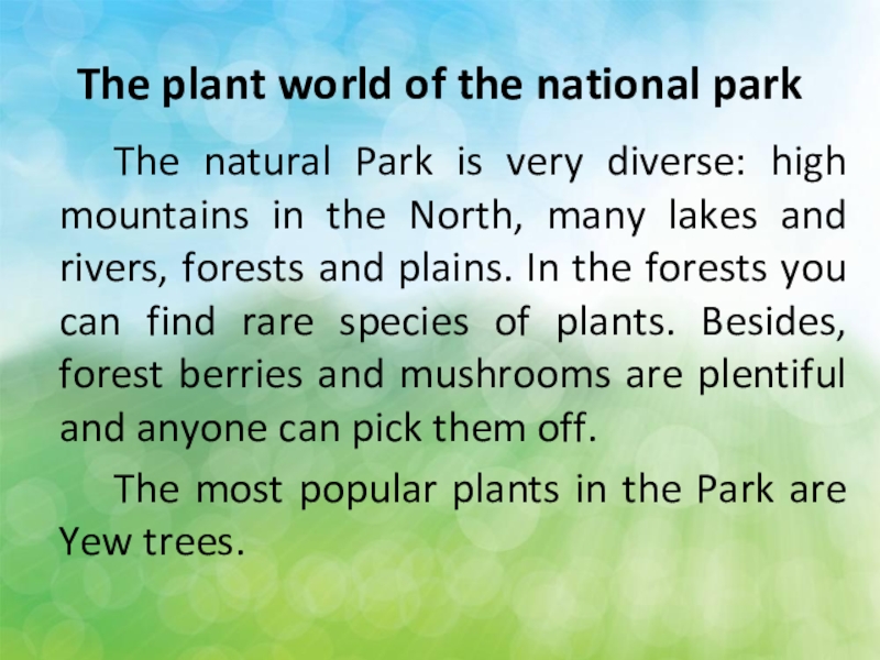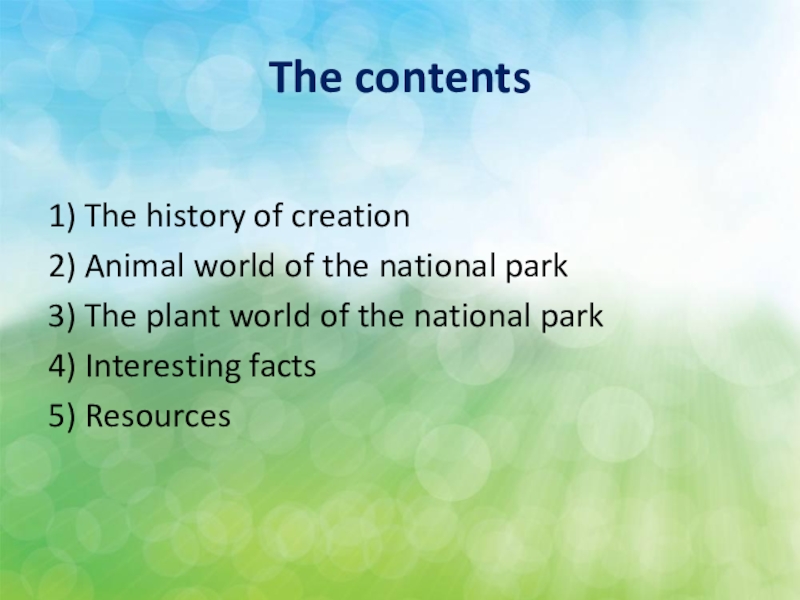 The contents1) The history of creation2) Animal world of the national park3) The plant world of the national park4) Interesting facts5) Resources