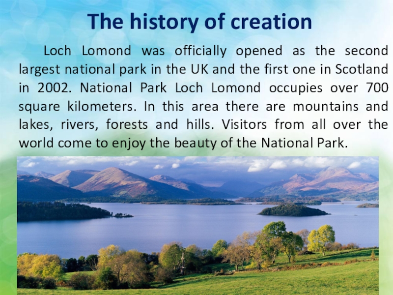 The history of creation		Loch Lomond was officially opened as the second largest national park in the UK