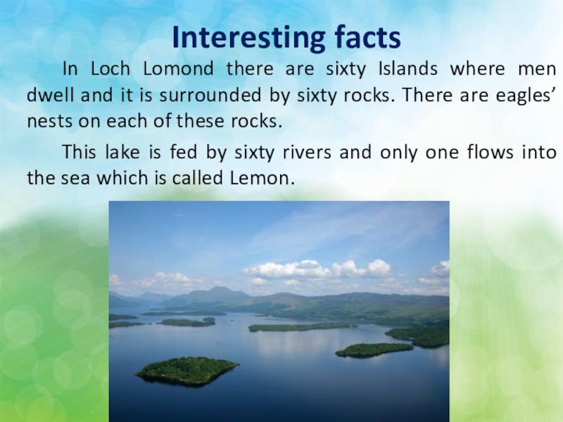 Interesting facts		In Loch Lomond there are sixty Islands where men dwell and it is surrounded by sixty