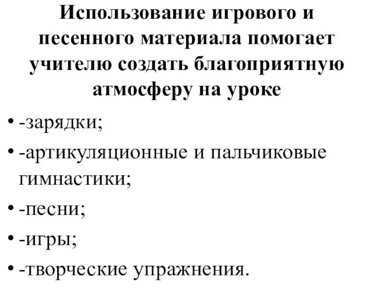Слайд 5Использование игрового и песенного материала помогает учителю создать благоприятную атмосферу на