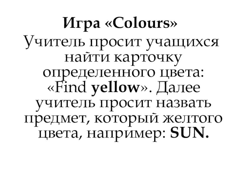 yellow». Далее учитель просит назвать предмет, который желтого цвета, например: SUN.