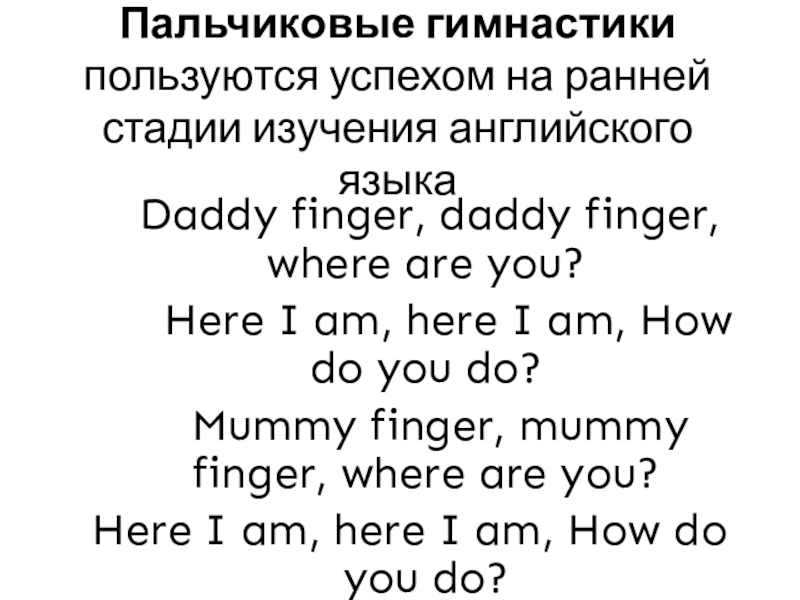 Слайд 9Пальчиковые гимнастики пользуются успехом на ранней стадии изучения английского языка