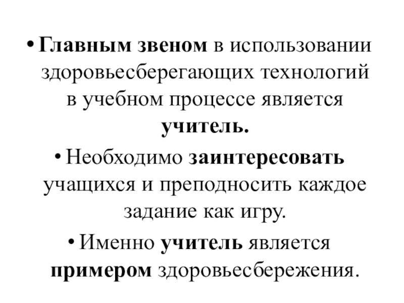 Слайд 15Главным звеном в использовании здоровьесберегающих технологий в учебном процессе является учитель.