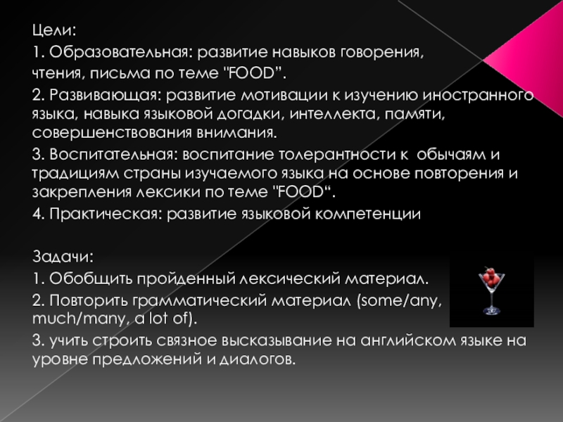 3. Воспитательная: воспитание толерантности к обычаям и традициям страны изучаемого языка на основе повторения и закрепления лексики по теме "FOOD“.