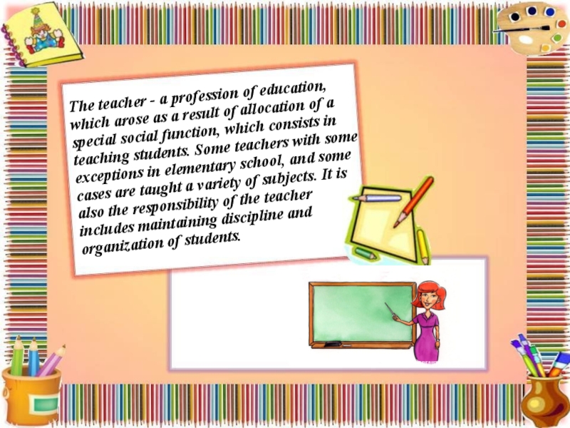 result of allocation of a special social function, which consists in teaching students. Some teachers with some exceptions in elementary school, and some cases are taught a variety of subjects. It is also the responsibility of the teacher includes maintaining discipline and organization of students.