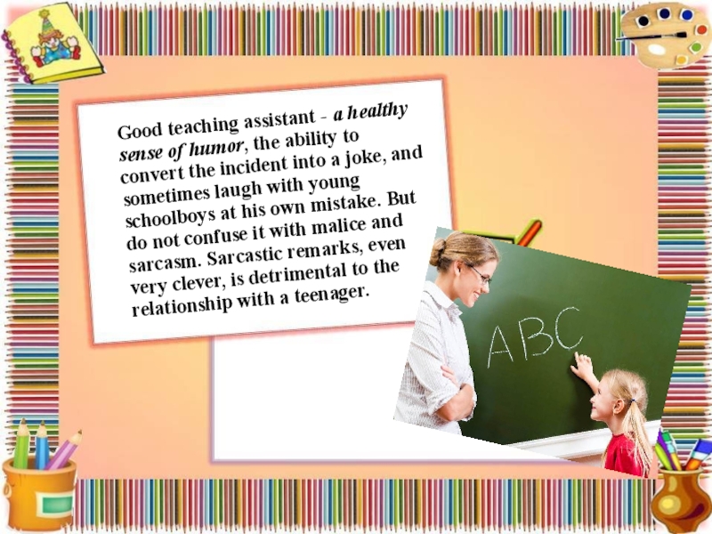 Слайд 4Good teaching assistant - a healthy sense of humor, the ability