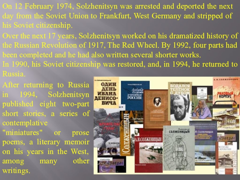 After returning to Russia in 1994, Solzhenitsyn published eight two-part short stories, a series of contemplative "miniatures" or prose poems, a literary memoir on his years in the West, among many other writings.