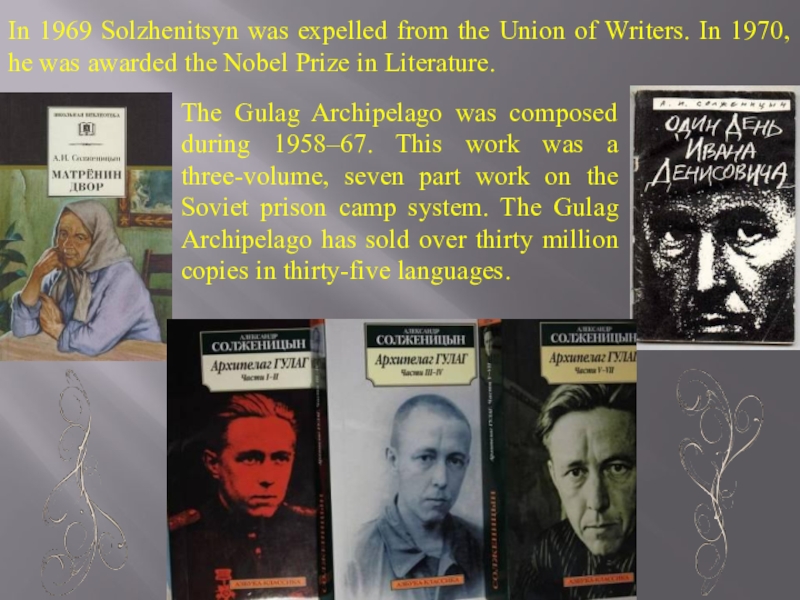 In 1969 Solzhenitsyn was expelled from the Union of Writers. In 1970, he was awarded the Nobel Prize in Literature.