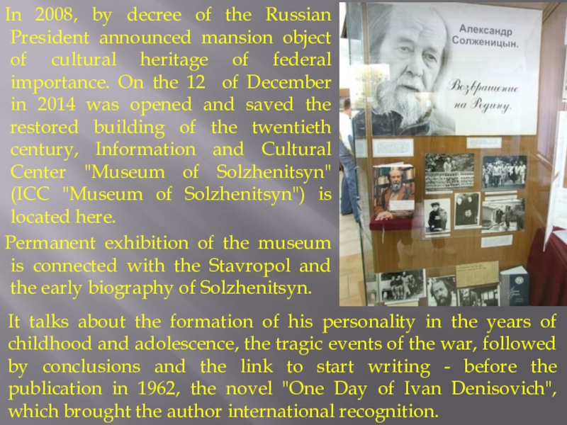 It talks about the formation of his personality in the years of childhood and adolescence, the tragic events of the war, followed by conclusions and the link to start writing - before the publication in 1962, the novel "One Day of Ivan Denisovich", which brought the author international recognition.