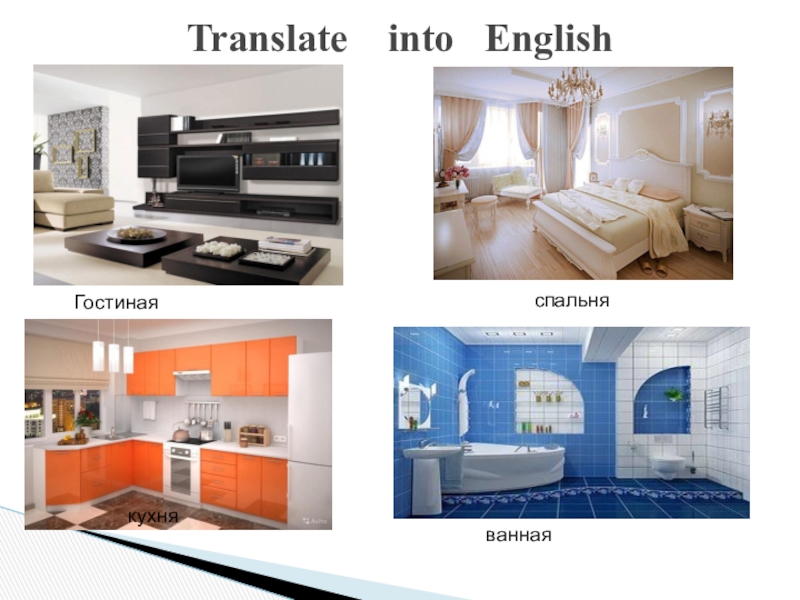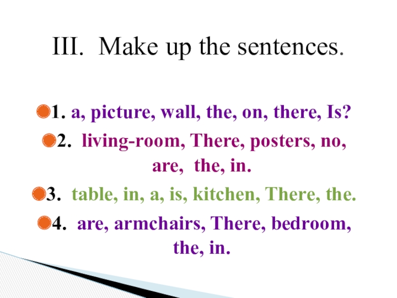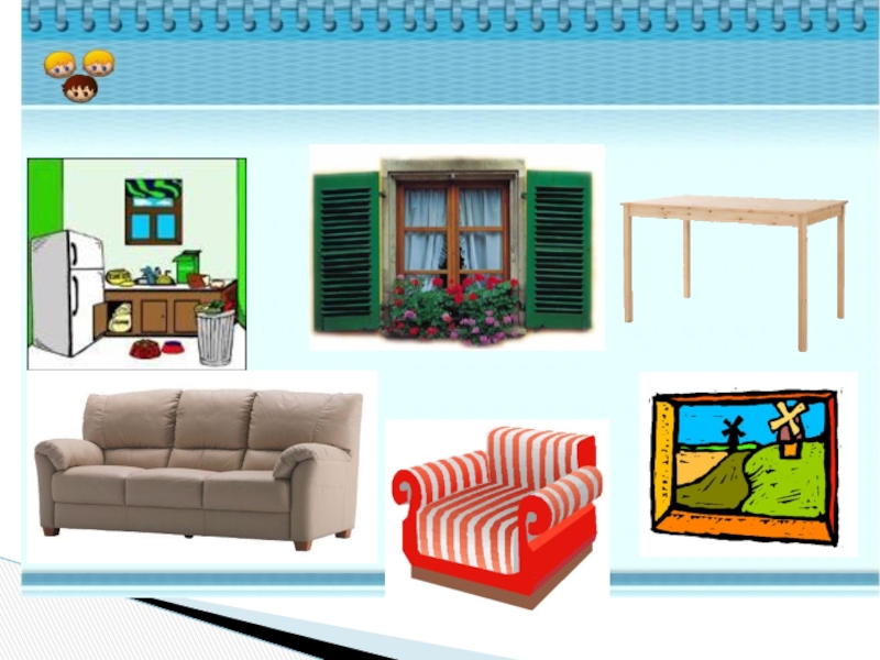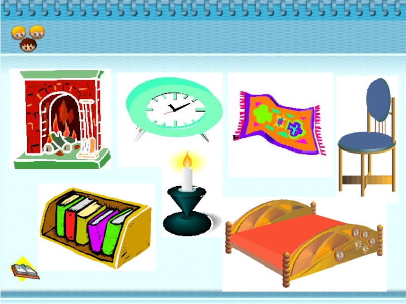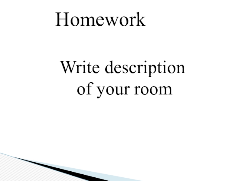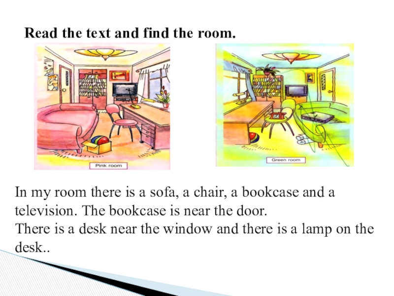 In my room there is a sofa, a chair, a bookcase and a television. The bookcase is near the door.