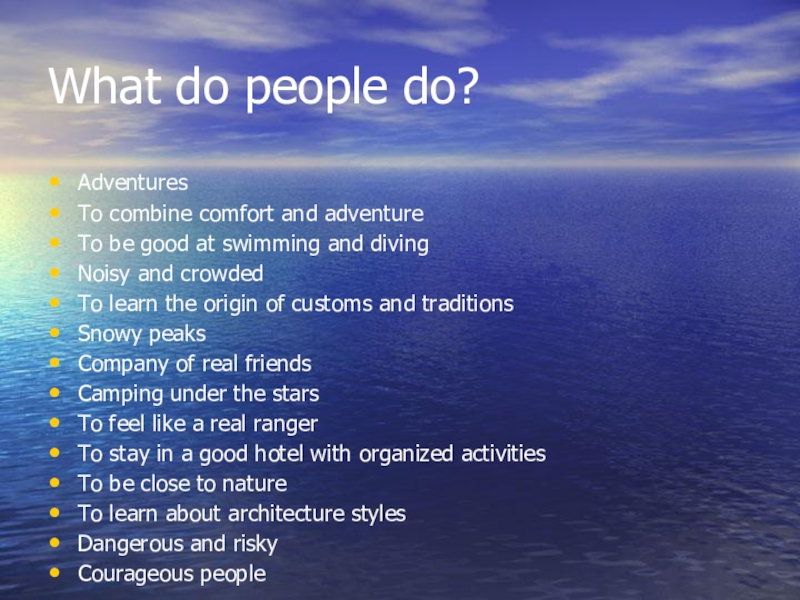 What do people do?Adventures To combine comfort and adventureTo be good at swimming and divingNoisy and crowdedTo