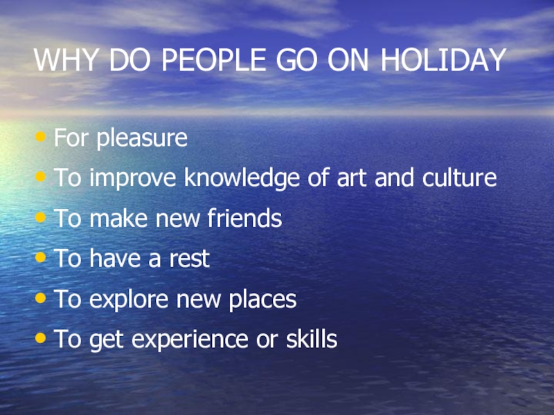 WHY DO PEOPLE GO ON HOLIDAYFor pleasureTo improve knowledge of art and cultureTo make new friendsTo have a restTo explore new placesTo get experience or skills