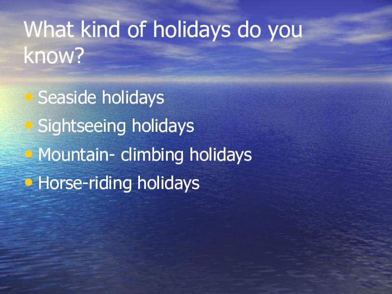 What kind of holidays do you know?Seaside holidaysSightseeing holidaysMountain- climbing holidaysHorse-riding holidays