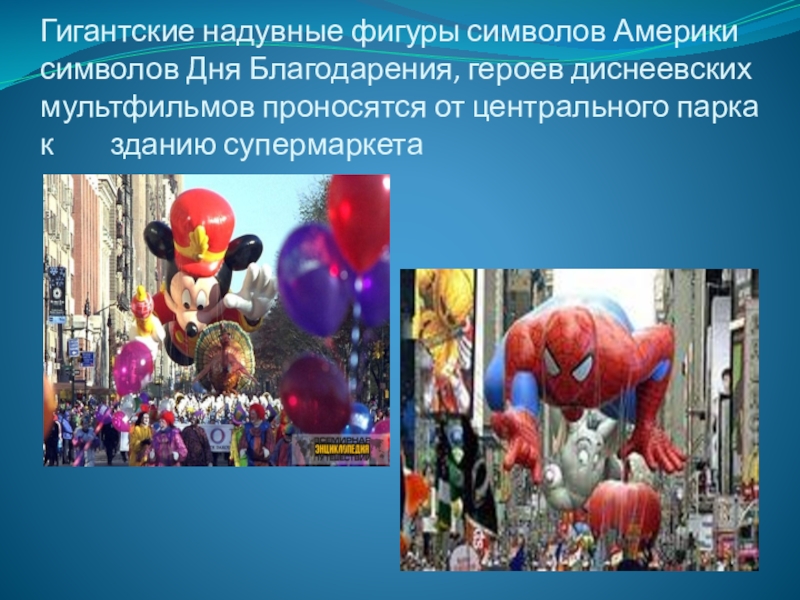 Слайд 11Гигантские надувные фигуры символов Америки символов Дня Благодарения, героев диснеевских мультфильмов