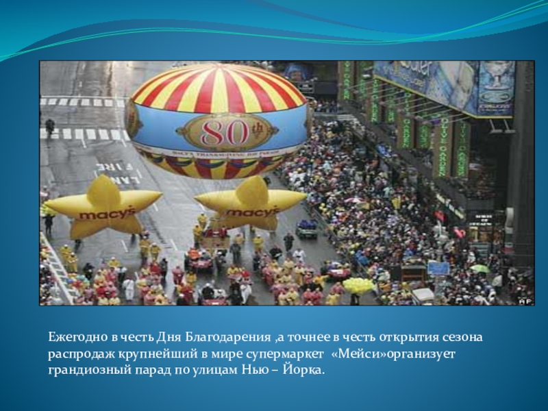 точнее в честь открытия сезона распродаж крупнейший в мире супермаркет «Мейси»организует грандиозный парад по улицам Нью – Йорка.