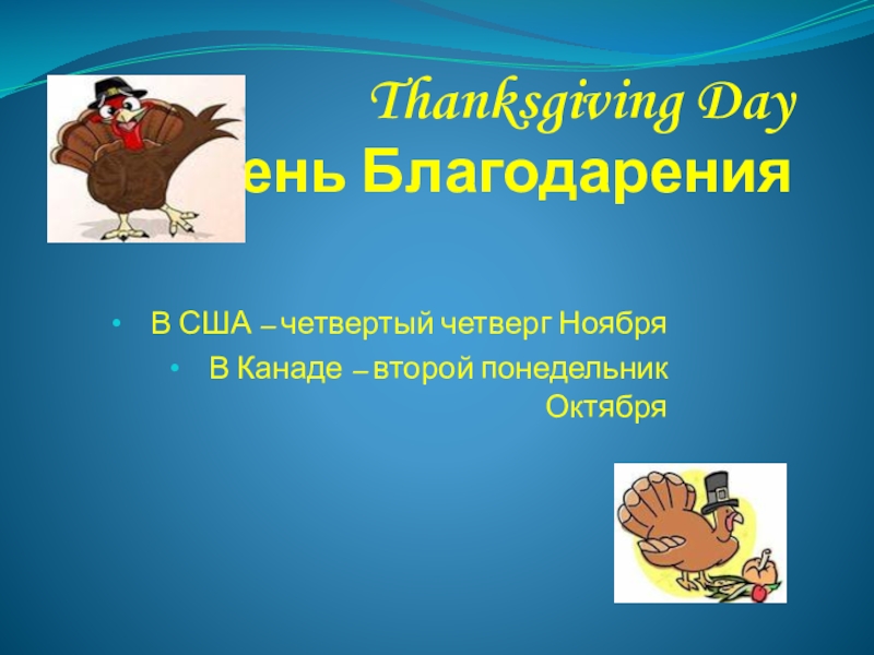 Thanksgiving Day День БлагодаренияВ США – четвертый четверг Ноября     В Канаде – второй