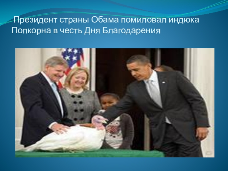 Слайд 14 Президент страны Обама помиловал индюка Попкорна в честь Дня Благодарения