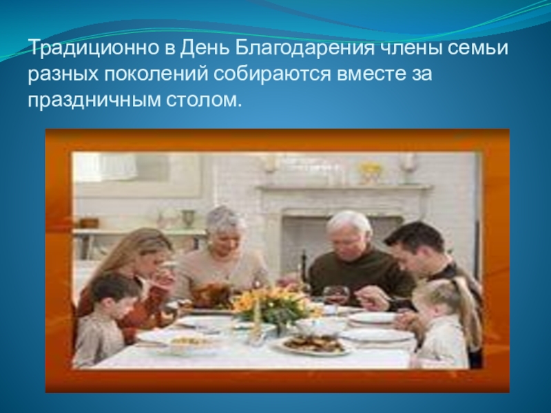 Слайд 8Традиционно в День Благодарения члены семьи разных поколений собираются вместе за