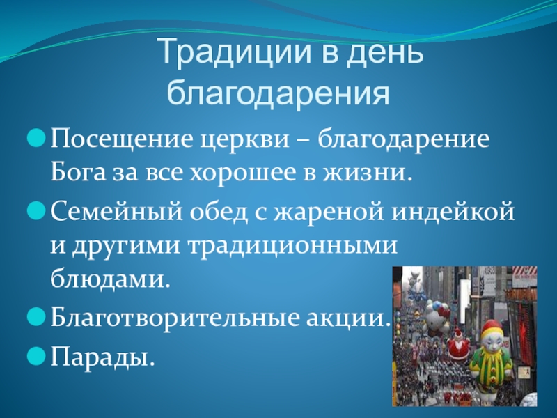 Other Thanksgiving Traditions: Attending or watching parades Ежегодно в честь Дня Благодарения ,а точнее в честь открытия