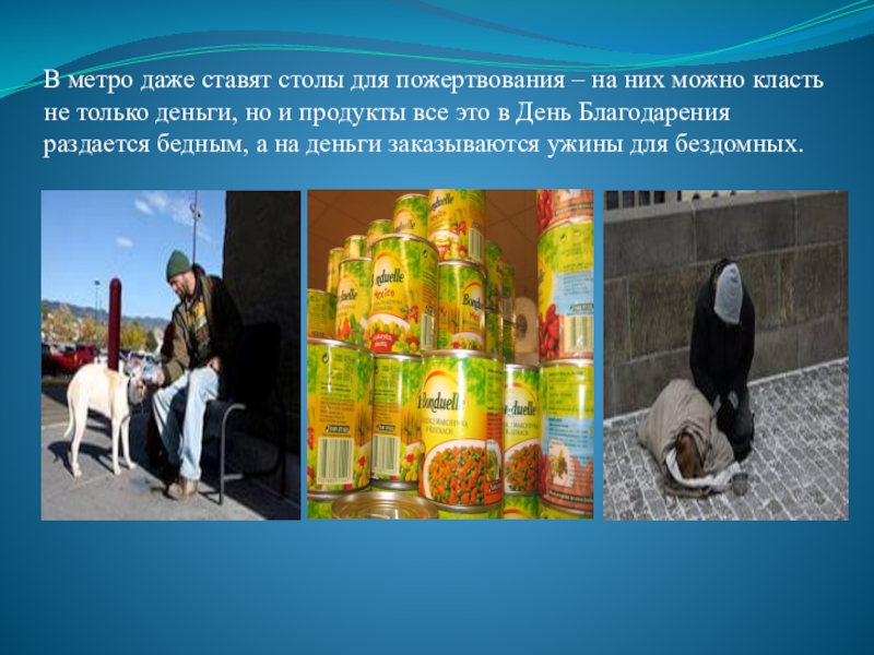 класть не только деньги, но и продукты все это в День Благодарения раздается бедным, а на деньги заказываются ужины для бездомных.