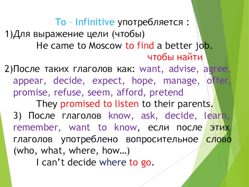 После таких глаголов как: want, advise, agree, appear, decide, expect, hope, manage, offer, promise, refuse, seem, afford, pretend