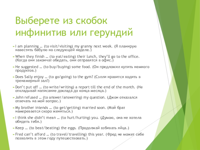 My brother intends … (to get/getting) married soon. (Мой брат намеревается скоро жениться.)