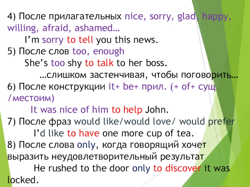 Слайд 34) После прилагательных nice, sorry, glad, happy, willing, afraid, ashamed…