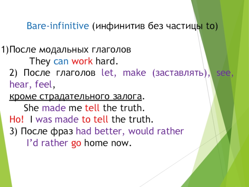 Слайд 4Bare-infinitive (инфинитив без частицы to)