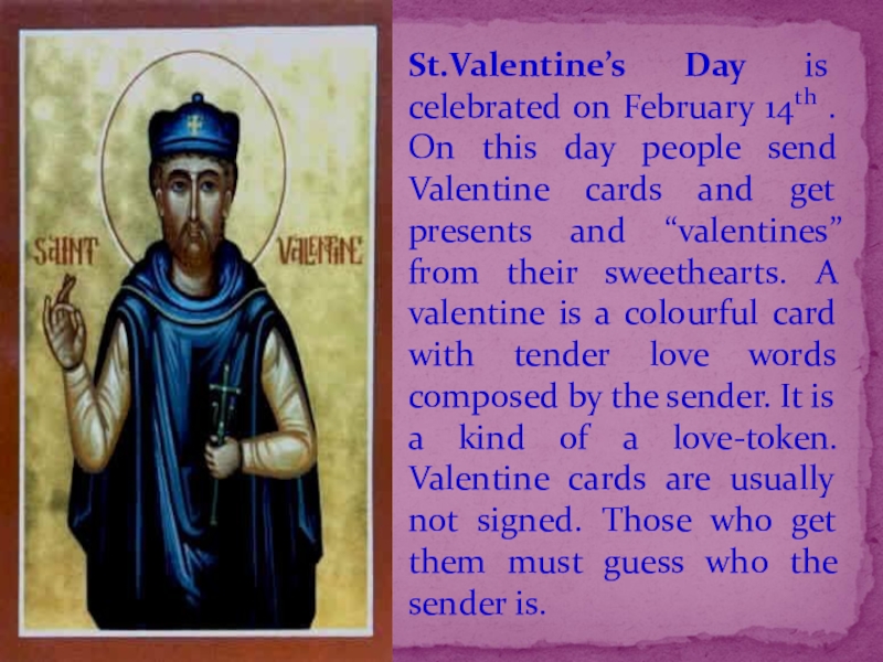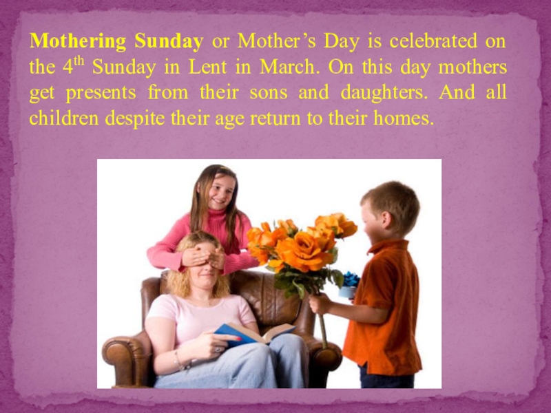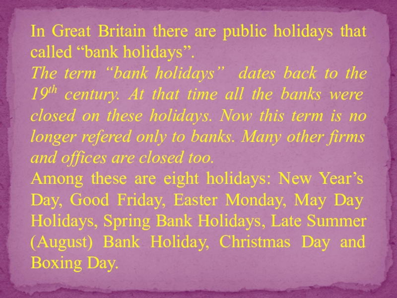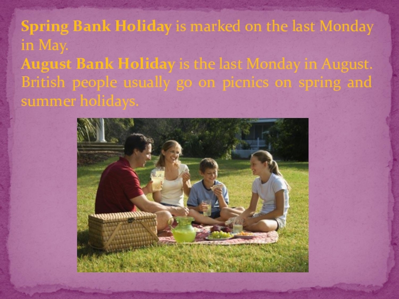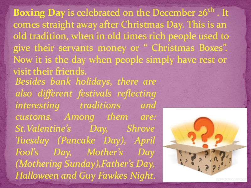 Besides bank holidays, there are also different festivals reflecting interesting traditions and customs. Among them are: St.Valentine’s Day, Shrove Tuesday (Pancake Day), April Fool’s Day, Mother’s Day (Mothering Sunday),Father’s Day, Halloween and Guy Fawkes Night.