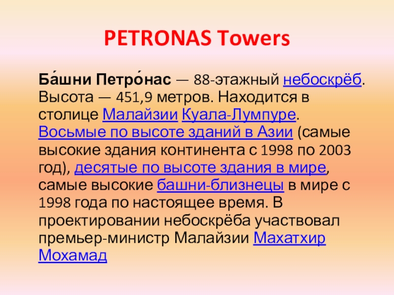 PETRONAS Towers  Ба́шни Петро́нас — 88-этажный небоскрёб. Высота — 451,9 метров. Находится в столице Малайзии Куала-Лумпуре. Восьмые по